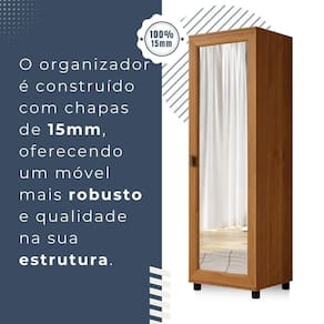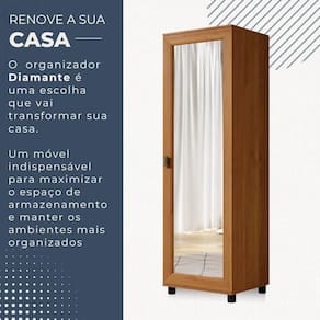 O Organizador Diamante e a escolha perfeita para quem busca durabilidade e sofisticacao. Produzido em chapa de MDP/BP de 15mm, ele e resistente e possui um design elegante. Com 5 prateleiras espacosas, voce tera muito espaco para organizar seus acessorios de forma eficiente. Alem disso, o destaque fica por conta da linda porta espelhada moldurada, que traz um toque de glamour ao ambiente. O Organizador Diamante e a peca ideal para adicionar charme e praticidade a sua decoracao.