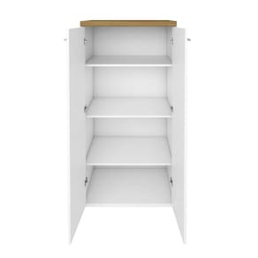 Feito com sua estrutura em MDP, seu tampo em Tamburato 37mm e fitas de borda PVC. Seu fundo com acabamento branco, podendo ser utilizado como divisória. Contém prateleiras internas sendo uma fixa e duas com regulagem de altura e sapatas plásticas.
