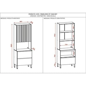 O PANELEIRO 3P 1GAV ART é fabricado com materiais de alta qualidade, garantindo durabilidade e resistência ao longo do tempo. Cada componente é cuidadosamente selecionado para oferecer o melhor em termos de construção e acabamento. Possuindo a precisão das dobradiças com amortecedor melhorando assim a praticidade e funcionalidade no dia a dia, evitando os impactos. As corrediças telescópicas revolucionam o funcionamento das gavetas, assegurando uma abertura e fechamento deslizante e suave. Essa tecnologia oferece um acesso amplo e facilitado ao conteúdo da gaveta, permitindo alcançar e visualizar os itens armazenados, mesmo os mais distantes. Os puxadores usinados a 45° graus são verdadeiras obras de arte que adicionam um toque minimalista na abertura e fechamento das portas e gavetas. Acabamento da Porta: Pintura Texturizada UV Acabamento da Prateleira: Pintura Texturizada UV Acabamento dos Pés: Liso Altura dos Pés: 17 cm Ambiente Principal: Cozinha Complexidade da Montagem: Média: pode ser montado por mais de uma pessoa e/ou necessite de maior conhecimento para montagem Cor: Freijó/Artico Cor do Produto: Freijó/Artico Cor Interna: Freijó/Branco Escala de Brilho: Fosco Escala de Brilho da Porta: Fosco Escala de Brilho da Prateleira: Fosco Informações Complementares: Considerar um peso bem distribuído por todo o produto. Itens Inclusos: 1 PANELEIRO 3P 1GAV ART + MANUAL DE MONTAGEM Linha ou Coleção: Cozinhas Compactas Manual de Montagem e Instalação: https://product-hub-prd.madeiramadeira.com.br/897567/documents/a511826d-5474-47b2-8a5a-707436ce77c388113018paneleiro3p1gavart.pdf Material da Dobradiça/Corrediça da Porta: Metálica Material da Porta: MDP Material da Prateleira: MDP Material dos Pés: Plástico Necessita Montagem: Sim Origem do Produto: Nacional Pés Reguláveis: Sim Peso: 53,48 kg Peso Máximo por Gaveta: kg Peso Máximo por Prateleira: 10 kg Possui Espelho: Não Possui Possui Pés: 04 Possui Portas: 02 Possui Prateleiras: 02 Possui Rodízio: Não Recomendações de Uso, Manutenção e Limpeza: Limpeza do produto somente com pano seco ou levemente umedecido, não utilizar abrasivos. Respeitar o limite de peso estabelecido no esquema de montagem. Evitar mover o produto com utensílios dentro. Sapatas Niveladoras: Não Sistema de Montagem: Pregos, parafusos e cavilha Tipo de Dobradiça/Corrediça da Porta: Soft close Tipo de Puxador da Porta: Embutido