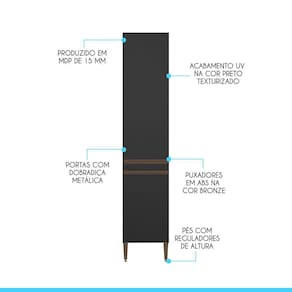 Armário Paneleiro Sabrina 40x202cm 2 Portas Mdp Menu Móveis Preto O Paneleiro de Cozinha Sabrina foi desenvolvido para atender todas as suas necessidades diarias com um design moderno, cheio de personalidade, beleza e versatilidade. Por se tratar de armario de cozinha modulado voce pode ajustar os modulos conforme o espaco disponivel e montar diversas modulacoes diferentes para deixar o ambiente muito mais aconchegante. A elegancia fica por conta dos puxadores em perfil e os pes na cor bronze dando um toque unico de sofisticacao. Produzido com materiais de excelente qualidade, garantindo a durabilidade e vida util. O melhor em moveis no design atual aliando conforto, qualidade e otimos precos, so na Menu Moveis! Caracteristicas: Produzido em MDP de 15 mm Acabamento UV na cor Preto Texturizado Portas com Dobradicas Metalicas Puxadores Perfil em ABS na cor Bronze Pes Regulaveis em ABS na cor Bronze Prateleiras suportam 5 Kg