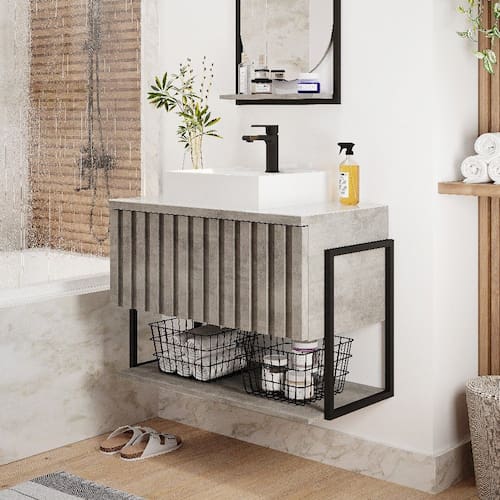 O Armário para banheiro suspenso Havai ira completar seu banheiro em grande estilo possui uma porta basculante em formato ripado com abertura com pistão à gás prateleira MDF puxadores em ABS estrutura MDF e metalon amplo espaço interno lavatório mármore sintético com mais durabilidade e resistência.
