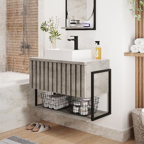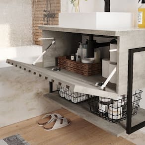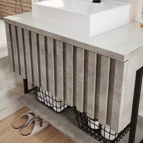 O Armário para banheiro suspenso Havai ira completar seu banheiro em grande estilo possui uma porta basculante em formato ripado com abertura com pistão à gás prateleira MDF puxadores em ABS estrutura MDF e metalon amplo espaço interno lavatório mármore sintético com mais durabilidade e resistência.