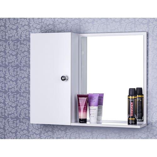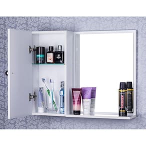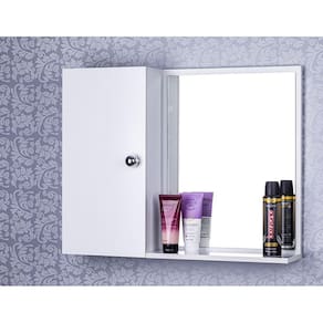Armário Espelheira Para Banheiro com Porta cor Branco com exclusivo sistema de fechamento suave da porta. É o único modelo do mercado com porta que fecha suavemente. - Bonito - Moderno - Prático - Materiais de primeira linha com ótimo acabamento - Prateleira interna que permite organizar vários itens É a solução ideal para decoração e organização do lar. Material: MDF 12mm com pintura UV branca Altura total: 46cm Largura total: 58cm Profundidade total: 12,5cm Peso: 3,5kg Instalação: a montagem e instalação do produto na parede são por conta do cliente Limpeza e conservação: recomenda-se a limpeza com pano úmido, não utilizar produtos abrasivos ou químicos Obs: Este anuncio inclui somente o armário com espelho, todos os itens de decoração das fotos não estão inclusos.
