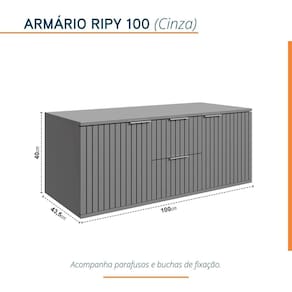 Produto fabricado em MDP PF (15mm), com ripas autênticas fabricadas em HDF BP (06mm), na largura de 20mm. Puxadores de alumínio anodizado, gavetas com corrediças telescópicas e portas com dobradiças slow (35 mm), que proporcionam fechamento suave das mesmas. Acompanha parafusos buchas para fixação na parede. Possui manual de instalação. Armário ideal para compor com as Bancadas Ripy da marca BLU LAVATÓRIOS (vide site do Madeira Madeira). Produto sai montado de fábrica, devidamente regulado, bastando apenas fixá-lo na parede. Garantia de 12 meses para defeito de fabricação. Acabamento da Gaveta: BP Acabamento da Porta: BP Ambiente Principal: Banheiro Cor: Cinza Cor do Produto: Cinza Cor Interna: Cinza Escala de Brilho: Acetinado Escala de Brilho da Gaveta: Semi-Fosco Escala de Brilho da Porta: Semi-Fosco Gaveta com Chave: Não Informações Complementares: Produto sai montado de fábrica, devidamente regulado, bastando apenas fixá-lo na parede. Itens Inclusos: 01 Armário Suspenso 100cm Linha ou Coleção: Ripy Manual de Montagem e Instalação: https://product-hub-prd.madeiramadeira.com.br/886103/documents/19ef098a-bf29-4368-88cb-acefc3939ee81930934armarioripy100.pdf Material da Gaveta: MDF/MDP Material da Porta: MDF/MDP Material do Puxador da Gaveta: Alumínio Material do Puxador da Porta: Alumínio Material Principal: MDF/MDP Necessita Montagem: Não Origem do Produto: Nacional Peso: 25,5 kg Peso Máximo por Gaveta: 4 Possui Espelho: Não Possui Pés: Não Possui Portas: 02 Possui Prateleiras: Não Recomendações de Uso, Manutenção e Limpeza: Nunca utilizar produtos químicos. Use somente flanela levemente umedecida em água e em seguida uma outra seca e macia. Caso ocorra vazamento ou acúmulo de água no produto, enxugar imediatamente. Suporta Até (kg): 5 Tipo de Corrediça da Gaveta: Metálica Telescópica Tipo de Dobradiça/Corrediça da Porta: Metálica Tipo de Porta: Bater Tipo de Puxador da Gaveta: Externo Tipo de Puxador da Porta: Externo