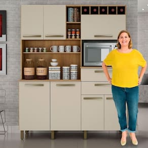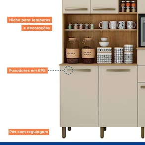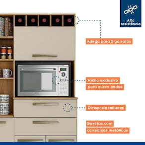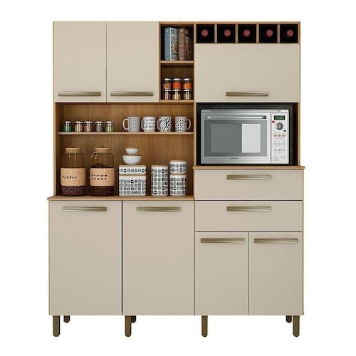 O Armario Monte Rey possui 7 portas (6 Portas de Bater e 1 Basculante), 2 gavetas externas e 4 Prateleiras. Alem disso, possui um espaco onde voce pode armazenar seu forno.