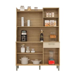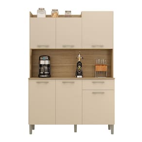 O Armário irá se tornar o charme de sua cozinha, seu design diferenciado dispõe de um nicho para decoração superior podendo ser utilizado para vasos, flores e outros. Tem a sua disposição de um grande espaço para Eltrodomésticos podendo acomodar um micro-ondas, sua matéria prima valoriza o meio ambiente sendo feita de madeira de reflorestamento. Com acabamento fosco e textura sensível ao toque em vários padrões mordernos.