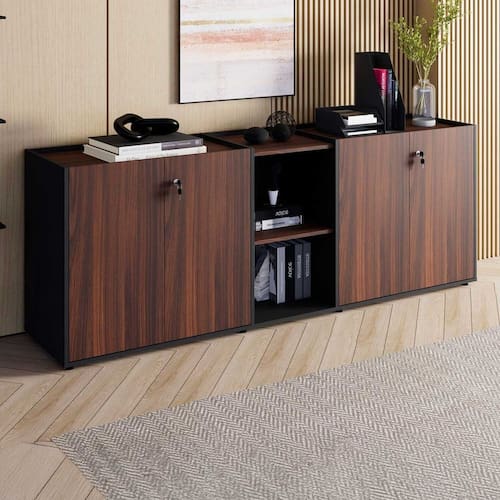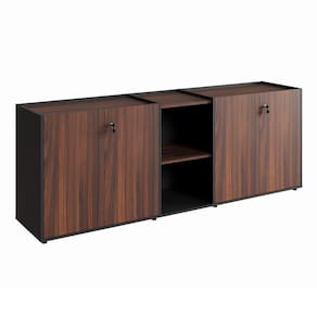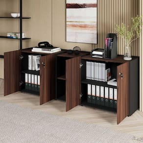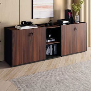 Armário Baixo Duplo F5 Office com portas e nicho central, une praticidade e elegância para manter o ambiente sempre organizado. Com design moderno e acabamento sofisticado, é ideal para escritórios, recepções e salas de reunião.