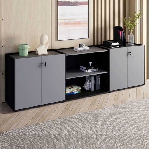 Armário F5 Office com 4 portas e nicho central, ideal para organizar documentos e materiais com praticidade e estilo. Com tampo embutido e design moderno, é perfeito para escritórios, recepções e salas de reunião.