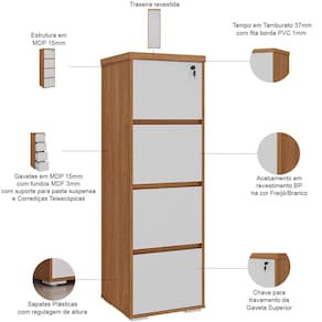 4 Gavetas em MDP 15mm com suporte para pasta suspensa e corrediças telescópicas.