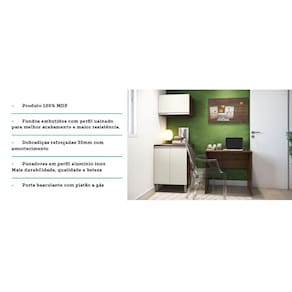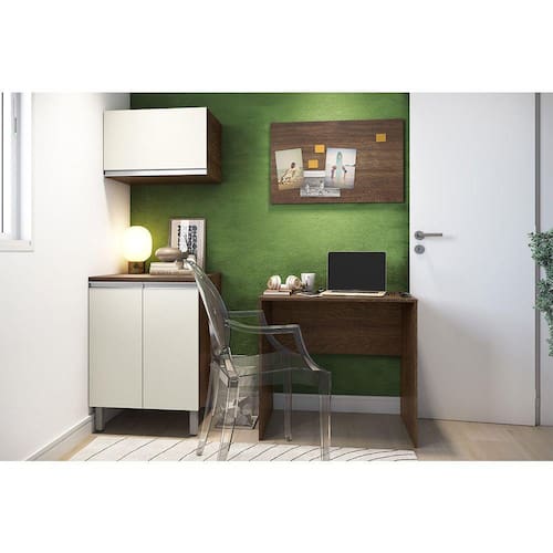 Armário para Escritório com Escrivaninha Nogueira Dourado com Branco Luciane MóveisO Armário para Escritório com Escrivaninha, acompanha um painel, balcão e um aéreo para ajudar na organização do seu dia, você pode usar esse produto de maneira bem versátil. Com acabamento em BP, maior resistência contra riscos.Características:Corpo/Caixaria: MDP - Nogueira Dourado - FF.Frontais: MDP - Acabamentos em BP. Dobradiças: Ø35mm Slow motion.Puxadores: Alumínio Gola - Inox.Porta: 1 basculante.Pistão a gás de 50N.Pés: P S - Cromado Compõe este ambiente:1-Armário Jade Basculante para Cozinha 60 cm 1 Porta Luciane1-Balcão de Cozinha sem Tampo 60cm 2 Portas Jade Luciane Móveis1-Escrivaninha Multiuso Compacta com Painel 80cm Prime Luciane Móveis1-Tampo Luciane 60 cmEscrivaninha Multiuso Compacta com Painel 80cm Prime Luciane MóveisDimensõesPainelAltura: 50 cmLargura: 80 cmProfundidade: 1,5cmEscrivaninhaAltura: 74 cmLargura: 80 cmProfundidade: 50 cmPeso Bancada + Painel: 25,5 KgArmário Jade Basculante para Cozinha 60 cm 1 Porta LucianeDimensões:Altura: 37,5 cmLargura: 60 cmProfundidade: 36,5 cmPeso: 10,5 kgBalcão de Cozinha sem Tampo 60cm 2 Portas Jade Luciane MóveisDimensões:Altura: 82,5 cmLargura: 60 cmProfundidade: 53 cmPeso: 19,95 kgTampo Luciane 60 cmDimensões do produto:Altura: 2,5 cmLargura: 60 cmProfundidade: 54,5 cmPeso: 5,7kgGarantia do fornecedor de 3 meses.Informações complementares:Fique de olho: siga sempre as orientações do fabricante e utilize seu produto de acordo com o manual. A empresa não se responsabiliza pelo mau uso do produto, o que pode causar perda da garantia.?Certifique se que seus dados estejam atualizados, como endereço e um telefone válido.A entrega será realizada no térreo, sendo assim em prédios o deslocamento da mercadoria, subir escadas, elevadores ou transporte por guincho para apartamentos fica sob responsabilidade do comprador.Todas as nossas entregas são realizadas em horário comercial, não sendo possível fazer agendamento, sugerimos acompanhar o rastreio do pedido e ter alguém para receber no endereço indicado.Não nos encarregamos por montagens, desmontagens e outras instalações, serão de responsabilidade do comprador.