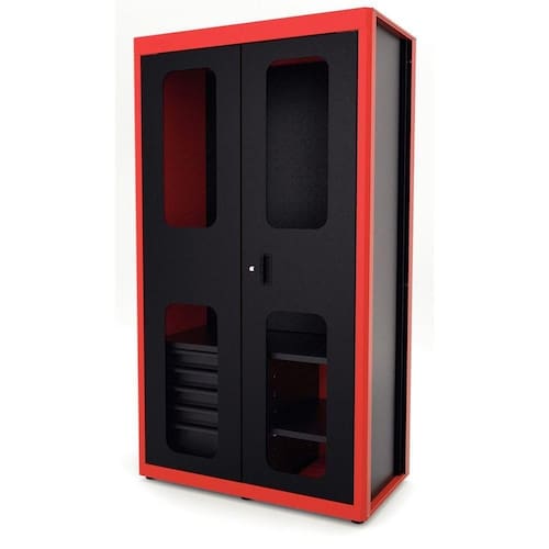 Estrutura em chapas de aço conformadas.2 portas com abertura de 100 com visores de acrílico.Módulo de ferramentas com 5 gavetas com corrediças telescópicas. Tranca para as portas e gavetas.Pintura eletrostática.Capacidade de carga máxima distribuída: 400 kg.Espessuras das chapas do corpo, portas e prateleiras do armário: 0,9 mm.Espessuras das chapas do módulo de ferramentas: 1,2 mm.Acompanha 30 ganchos para ferramentas de 65 mm de comprimento.
