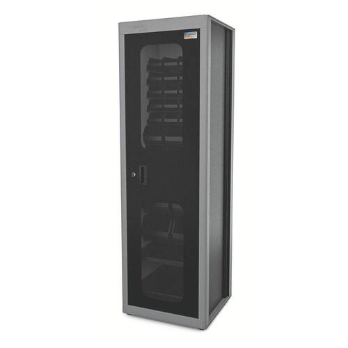 Estrutura em chapas de aço conformadas. Porta com abertura de 100 com visores de acrílico. Tranca para as portas. Pintura eletrostática. Capacidade de carga máxima distribuída: 200 kg. Capacidade de carga distribuída de cada prateleira: 60 kg. Espessuras das chapas do corpo, porta e prateleiras: 0,9 mm.Utilizado para armazenamento de ferramentas. Possui 2 prateleiras móveis que possibilitam diferentes configurações de montagem. Acompanha 29 caixas plásticas BIN sendo 16 caixas n 3, 9 caixas n 5 e 4 caixas n 7 para o armazenamento de peças pequenas, tais como parafusos, porcas, arruelas, etc. Com 4 pés para regulagem de altura, para compensar irregularidades no piso. Porta com visores de acrílico que possibilita visualizar a parte interna. Abertura da porta para a direita. Capacidade de carga e resistência da estrutura comprovadas através de testes práticos.