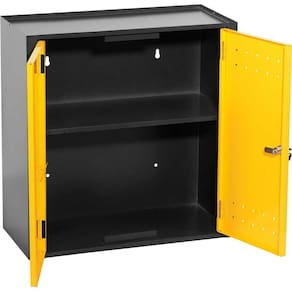 Tipo: Armário de parede | Cor do armário: Preto e amarelo | Material do armário: Aço carbono | Acabamento: Pintado | Altura: 58,0 cm | Largura: 60,0 cm | Profundidade: 26,6 cm | Massa aproximada (peso) (kg): 8,3 kg