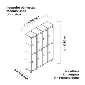 Armário Roupeiro de Aço totalmente montável, dispensa a utilização de parafusos, estrutura em chapas #24 e #26 (0,60mm e 0,45mm) conta com uma porta com estampos circulares em formação triangular para ventilação, sistema de fechamento de varão de 3 pontos, através de pitão para cadeado.