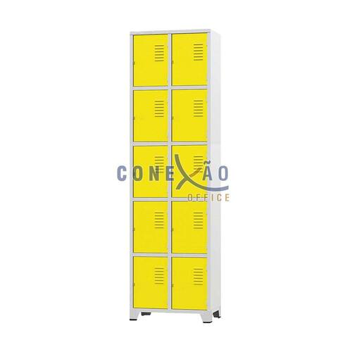 Armário Roupeiro de aço para vestiário, produzido em aço chapa 26 0,45mm, possui 10 portas com venezianas para ventilação, compartimento de tamanho médio independentes sem divisórias internas, fechamento das portas através de pitão para cadeado.