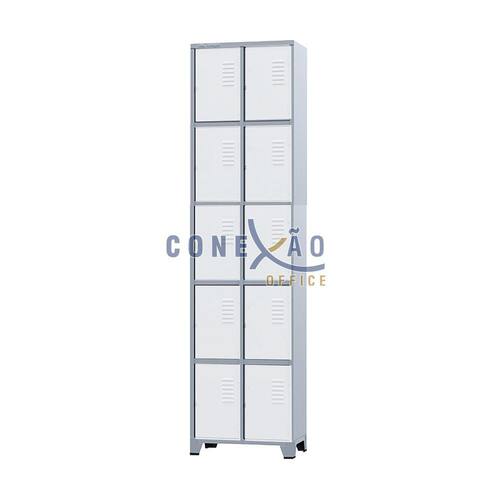 Armário Roupeiro de aço para vestiário, produzido em aço chapa 26 0,45mm, possui 10 portas com venezianas para ventilação, compartimento de tamanho médio independentes sem divisórias internas, fechamento das portas através de pitão para cadeado.