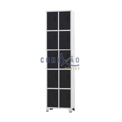 Armário Roupeiro de aço para vestiário, produzido em aço chapa 26 0,45mm, possui 10 portas com venezianas para ventilação, compartimento de tamanho médio independentes sem divisórias internas, fechamento das portas através de pitão para cadeado.