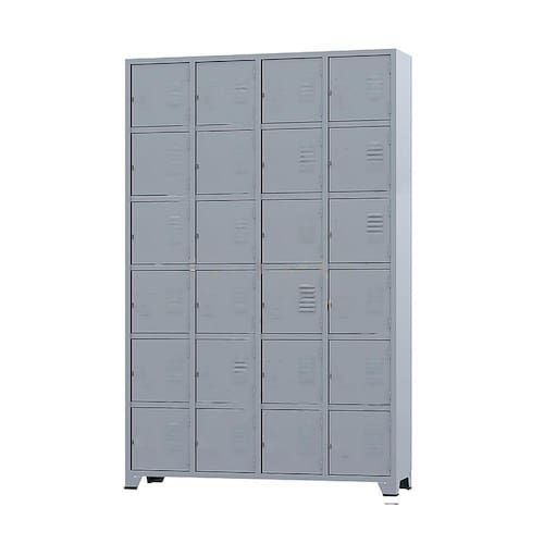 Armário Roupeiro de aço para vestiário,ideal para academias, surpermercados, empresa e para uso geral. Produzido em aço chapa 26 0,45mm de alta qualidade com tratamento anti-ferruginoso, o acabamento em sistema de pintura eletrostática a alta temperatura epóxi, tambem garante maior durabilidade da cor e resistencia a ferrugem. Possui 24 portas com venezianas para ventilação, compartimentos de tamanhos médios independentes sem divisórias internas, que garante que você consiga armazenar itens como bolsas, mochilas e entre outros. O fechamento das portas é através de pitão para cadeado.