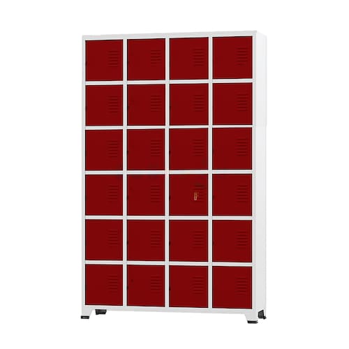 Armário Roupeiro de aço para vestiário,ideal para academias, surpermercados, empresa e para uso geral. Produzido em aço chapa 26 0,45mm de alta qualidade com tratamento anti-ferruginoso, o acabamento em sistema de pintura eletrostática a alta temperatura epóxi, tambem garante maior durabilidade da cor e resistencia a ferrugem. Possui 24 portas com venezianas para ventilação, compartimentos de tamanhos médios independentes sem divisórias internas, que garante que você consiga armazenar itens como bolsas, mochilas e entre outros. O fechamento das portas é através de pitão para cadeado.