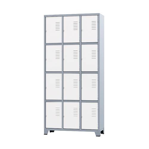 CONEXÃO OFFICEArmário Roupeiro de aço para vestiário,ideal para academias, surpermercados, empresa e para uso geral. Produzido em aço chapa 26 0,45mm de alta qualidade com tratamento anti-ferruginoso, o acabamento em sistema de pintura eletrostática a alta temperatura epóxi, tambem garante maior durabilidade da cor e resistencia a ferrugem. Possui 12 portas com venezianas para ventilação, compartimentos de tamanhos médios independentes sem divisórias internas, que garante que você consiga armazenar itens como bolsas, mochilas e entre outros. O fechamento das portas é através de chave. Características:- Quantidade de Portas: 12- Cor: Corpo Cinza / Portas Brancas- Chapa: 26 / 0,45mm- Medida das Portas/ Vãos: 046Alt x 027Larg- Sistema de Ventilação: Veneziana- Fechamento: chave- Quantidade de cabides por porta: 0- Pés removíveis: Não- Desmontável: Não ( Exceto portas que podem ser trocadas ).- Pintura: Epóxi Pó- Imagens meramente ilustrativas.- As cores podem apresentar variações de tonalidade.ALTURA: 197cmLARGURA: 92cmPROFUNDIDADE: 36cmPESO: 40kgEspecificação de chapa e acabamento: Roupeiro produzido em chapa de aço tratada com antiferruginoso por fosfatização e pintura epóxi-pó por processo eletrostático.