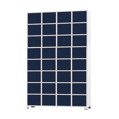CONEXÃO OFFICEArmário Roupeiro de aço para vestiário,ideal para academias, surpermercados, empresa e para uso geral. Produzido em aço chapa 26 0,45mm de alta qualidade com tratamento anti-ferruginoso, o acabamento em sistema de pintura eletrostática a alta temperatura epóxi, tambem garante maior durabilidade da cor e resistencia a ferrugem. Possui 32 portas com venezianas para ventilação, compartimentos de tamanhos médios independentes sem divisórias internas, que garante que você consiga armazenar itens como bolsas, mochilas e entre outros. O fechamento das portas é através de chave. Características- Quantidade de Portas: 32- Cor: Corpo Cinza / Portas Azul Marinho- Chapa: 26 / 0,45mm- Medida das Portas/ Vãos: 023Alt x 027Larg- Sistema de Ventilação: Veneziana- Fechamento: chave- Quantidade de cabides por porta: 0- Pés removíveis: Não- Desmontável: Não ( Exceto portas que podem ser trocadas ).- Pintura: Epóxi Pó- Imagens meramente ilustrativas.- As cores podem apresentar variações de tonalidade.ALTURA: 197cmLARGURA: 122cmPROFUNDIDADE: 36cmPESO: 50kgEspecificação de chapa e acabamento: Roupeiro produzido em chapa de aço tratada com antiferruginoso por fosfatização e pintura epóxi-pó por processo eletrostático.
