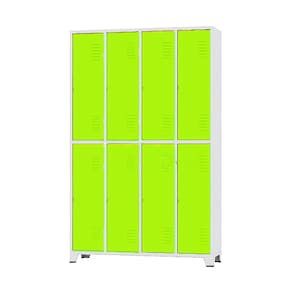 CONEXÃO OFFICEArmário Roupeiro de aço para vestiário,ideal para academias, surpermercados, empresa e para uso geral. Produzido em aço chapa 26 0,45mm de alta qualidade com tratamento anti-ferruginoso, o acabamento em sistema de pintura eletrostática a alta temperatura epóxi, tambem garante maior durabilidade da cor e resistencia a ferrugem. Possui 8 portas com venezianas para ventilação, compartimentos de tamanhos médios independentes sem divisórias internas, que garante que você consiga armazenar itens como bolsas, mochilas e entre outros. O fechamento das portas é através de CHAVE. Características:- Quantidade de Portas: 08- Corpo: Corpo Cinza / Portas Verdes- Chapa: 26 / 0,45mm- Medida das Portas/ Vãos: 092Alt x 027Larg- Sistema de Ventilação: Veneziana- Fechamento: CHAVE- Quantidade de cabides por porta: 2- Pés removíveis: Não- Desmontável: Não ( Exceto portas que podem ser trocadas ).- Pintura: Epóxi Pó- Imagens meramente ilustrativas.- As cores podem apresentar variações de tonalidade.ALTURA: 198cmLARGURA: 122cmPROFUNDIDADE: 36cmPESO: 50kgEspecificação de chapa e acabamento: Roupeiro produzido em chapa de aço tratada com antiferruginoso por fosfatização e pintura epóxi-pó por processo eletrostático.