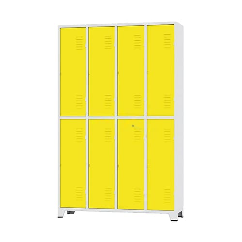 Armário Roupeiro de aço para vestiário,ideal para academias, surpermercados, empresa e para uso geral. Produzido em aço chapa 26 0,45mm de alta qualidade com tratamento anti-ferruginoso, o acabamento em sistema de pintura eletrostática a alta temperatura epóxi, tambem garante maior durabilidade da cor e resistencia a ferrugem. Possui 8 portas com venezianas para ventilação, compartimentos de tamanhos médios independentes com 1 prateleira, que garante que você consiga armazenar itens como bolsas, mochilas e entre outros. O fechamento das portas é através de pitão para cadeado.