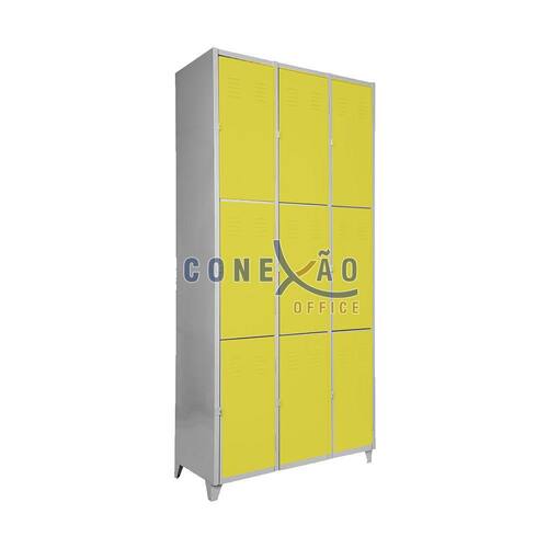 Armário Roupeiro de aço para vestiário, produzido em aço chapa 26 0,45mm, possui 3 portas com venezianas para ventilação, compartimento de tamanho grandes independentes sem divisórias internas, fechamento das portas através de pitão para cadeado.
