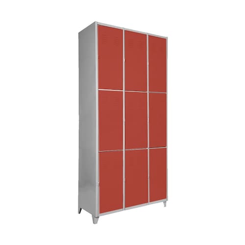 CONEXÃO OFFICE Armário Roupeiro de aço para vestiário, produzido em aço chapa 26 0,45mm, possui 3 portas com venezianas para ventilação, compartimento de tamanho grandes independentes sem divisórias internas, fechamento das portas através de CHAVE.Características- Quantidade de Portas: 9- Cor: Vermelho- Chapa: 26 / 0,45mm- Medida das Portas/ Vãos: 092Alt x 027Larg- Sistema de Ventilação: Veneziana- Fechamento: CHAVE- Quantidade de cabides por porta: 2- Pés removíveis: Não- Desmontável: Não ( Exceto portas que podem ser trocadas ).- Pintura: Epóxi PóALTURA: 198cmLARGURA: 093cmPROFUNDIDADE: 37cmPESO: 30kgGARANTIA: 6 MesesEspecificação de chapa e acabamento: Roupeiro produzido em chapa de aço tratada com antiferruginoso por fosfatização e pintura epóxi-pó por processo eletrostático.