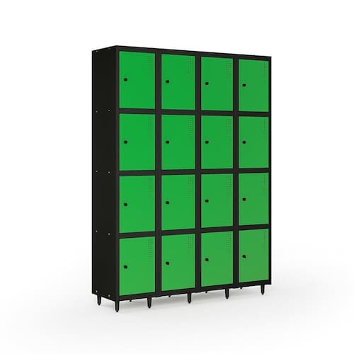 Fabricado em chapa de aço nº 26 (0,045cm), o roupeiro conta com 16 portas individuais, tratamento anticorrosão e pintura eletrostática a pó.