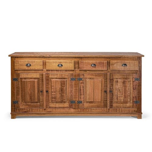 Arca rústica em madeira maciça, com acabamento natural que valoriza os veios da madeira. Com quatro portas e quatro gavetas, oferece charme, funcionalidade e muito espaço para organizar e decorar com estilo.