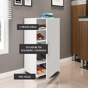 Armário Sapateira Multiuso Organizador Flávia 4 Prateleiras A Sapateira 1 porta 4 prateleiras Flávia é um produto para compor seu ambiente com praticidade e estilo. Amplo espaço interno com 04 prateleiras móveis para melhor acomodação dos calçados. Puxador em polímero, pés PVC fixo garantindo firmeza ao móvel, em MDP com acabamento em pintura UV brilho. Qualidade que só a Poliman oferece em seus produtos. (A quantidade de calçados pode variar de acordo com o modelo e tamanho dos ões:- Altura: 82cm;- Largura: 43cm;- Profundidade: 34cm;- Peso: 13,700kg.- Sapateira com pés PVC fixos 5cm;- Prateleiras Internas em MDP Pintura UV;- Escala de brilho: brilhante;- 1 porta;- 2 dobradiças de aço 26mm;- Puxador em polímero;- 4 prateleiras removíveis;- Suporta até limpeza utilize pano macio levemente umedecido e na sequência pano seco. Não usar produtos químicos ou abrasivos para a limpeza.
