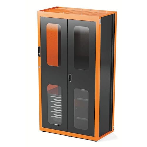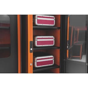 Estrutura em chapas de aço conformadas.Espessuras das chapas: 0,9 mm.Pintura eletrostática a pó.Duas portas com abertura de 100 5 prateleiras móveis possibilitando diferente configurações de montagem.Capacidade de carga máxima repartida: 400 kg Capacidade de carga distribuída de cada prateleira: 60 kg 6 Pés com regulagem de altura para melhor nivelamento do armário no piso. Acompanha 30 ganchos para ferramentas de 65 mm de comprimento. Portas com trancas eletrônicas.Abertura dos armários por meio eletrônico através do cartão de acesso de 13.56 MHz de frequência. Conector Painel C14 para ligação na tomada elétrica 10A 250 VAC. Conector painel C13 para interligação com outros armários 10A 250 VAC. Cabo de alimentação em cobre 3x0,75 mm comp. 3000 mm Isolação em PVC preto 65 graus 250VAC 10A com plug, utilizado para ligar os organizadores na rede elétrica. Cabo de alimentação em cobre 3x0,75 mm comp. 600 mm Isolação em PVC preto 65 graus 250V VAC 10A C13 - C14 com plug 90 graus supply AC, utilizado para interligar os organizadores.Contato para projetos especiais: modular.gar@tramontina.com