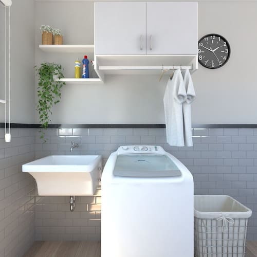 Suspenso, ele libera espaço no chão, facilitando o movimento e a organização. Feito com materiais de alta qualidade, é resistente e durável, com portas de fechamento suave que evitam ruídos incômodos, o ideal para qualquer lavanderia.