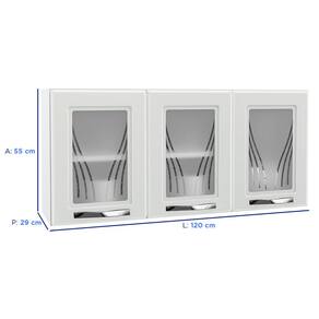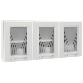 Caracteristicas: Armario triplo em aco, medindo 120cm de largura por 55cm de altura. Pintura eletrostatica a po, mais resistencia e durabilidade ao produto. Puxadores em acrilico, mais beleza ao produto. Vidros temperados e serigrafados, mais seguranca e beleza ao produto. Este produto se diferencia por sua beleza estetica e resistencia. Ideal para complemento de cozinha, garagens e areas de servico.