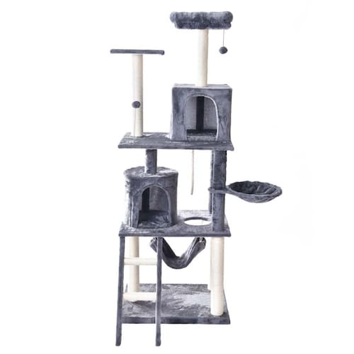 Possui colunas que são revestidas de fibra natural de sisal para seus felinos afiarem e lixarem suas unhas.