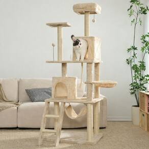 Desenhado por pessoas apaixonadas por gatos, esse luxuoso arranhador é composto por: Duas casas grandes, sendo uma quadrada e outra redonda, cama espaçosa com borda macia, cesto, poleiros, sendo um deles vazado para a passagem dos felinos, rede, base, escada, dois brinquedos em balanço no formato de bolinha e corda de sisal.