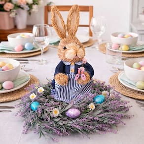 Deixe sua Páscoa ainda mais charmosa com este lindo arranjo decorativo de coelha. Ideal para centro de mesa, aparador, balcão ou prateleira, ele traz um toque delicado e acolhedor para a decoração pascal, combinando perfeitamente com ambientes clássicos ou modernos