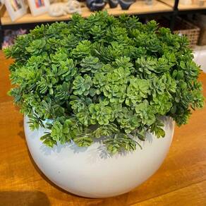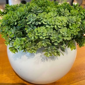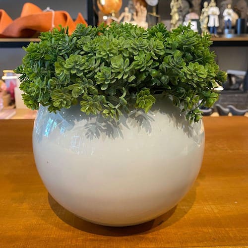 Arranjo permanente de verdinho em efeito hiper-realista com vaso de vidro Branco.