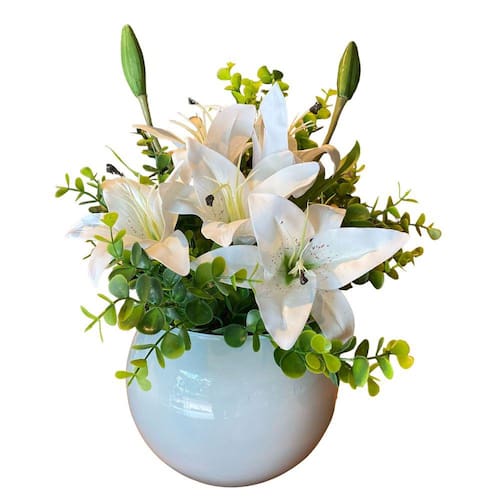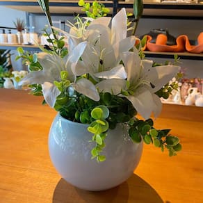 Arranjo permanente de Lírio em efeito hiper-realista com vaso branco.