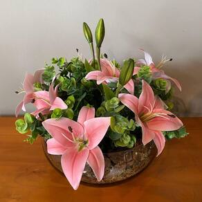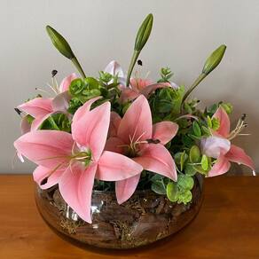 Com lírio, verdinho, cascas e vaso em vidro, esse arranjo é ideal para aparador, mesa de jantar ou aparador.