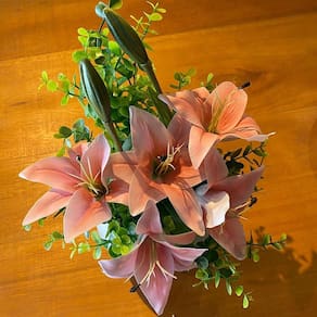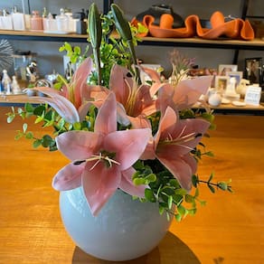 Arranjo permanente de Lírio em efeito hiper-realista com vaso branco.