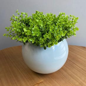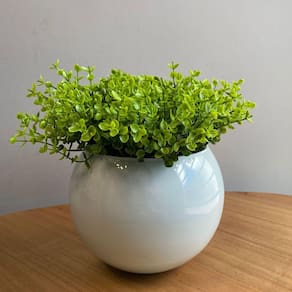 Arranjo permanente de verdinho em efeito hiper-realista com vaso branco.
