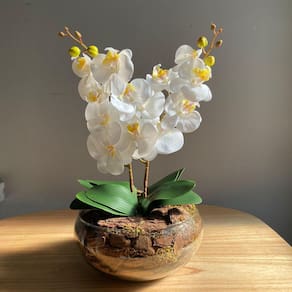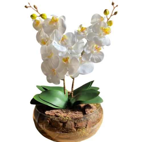Com 4 folhas, 2 orquídeas 3d, cascas e vaso em vidro, esse arranjo é ideal para aparador, mesa de jantar ou banheiro.