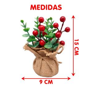 Com design elegante e detalhes natalinos, ele combina cerejas decorativas, pinhas artificiais, folhagens verdes e um vaso feito saco de juta charmoso que valoriza qualquer ambiente!
