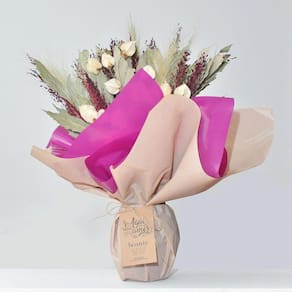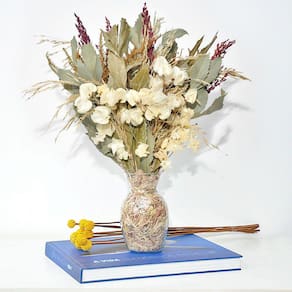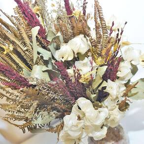 Todos os nossos arranjos e buquês são criados com flores naturais desidratadas artesanalmente. Por ser um processo manual, isso garante que cada arranjo seja único em sua composição.