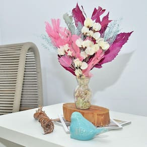 Todos os nossos arranjos e buquês são criados com flores naturais desidratadas artesanalmente. Por ser um processo manual, isso garante que cada arranjo seja único em sua composição.