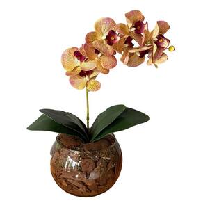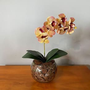 Com 4 folhas, orquídea 3d, cascas e vaso em vidro, esse arranjo é ideal para aparador, mesa de jantar ou banheiro.