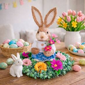Deixe sua Páscoa ainda mais charmosa com este lindo arranjo decorativo de coelho com flores. Ideal para centro de mesa, aparador, balcão ou prateleira, ele traz um toque delicado e acolhedor para a decoração pascal, combinando perfeitamente com ambientes clássicos ou modernos