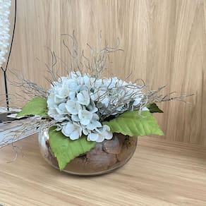 Arranjo permanente de Hortênsias em efeito hiper-realista com vaso incolor de vidro.
